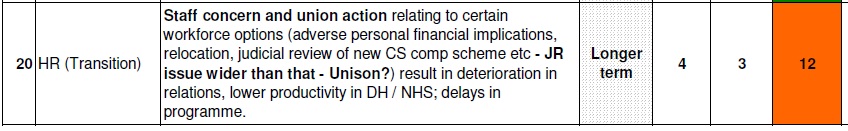 No. The government blocked the Freedom of Information Act request for the release of the Health Dept risk assessment of the (at that time proposed and now being implemented) changes, vetoing the release in defiance of a several court judgments that it should make the assessment public. However, under public pressure they did release an edited version. The 3 images below are of items in the edited report (and if these are in the edited version, God knows how much worse the parts they’re hiding must be!). 2 items are red-flagged (typically, the one about impact on staff only gets an amber flag):