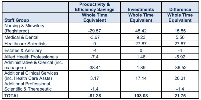 Since I wrote that post, I’ve received some additional information, from an NHS staff nurse (@archangelolill on Twitter), about the implications of the specific measures STHNHST is being forced to undertake because of the Coalition’s ‘efficiency’ drive, and which show even more clearly the ways in which these measures are overstretching even the dedicated, professional people who staff our NHS hospitals and other facilities. We’ll look in some more detail at the specific cuts and extensions, and what they mean. FIrst, here’s the table that the Trust sent me again: