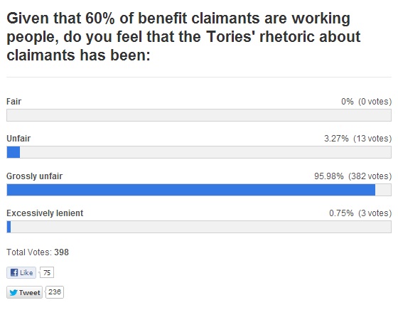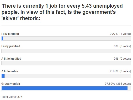 Just one single respondent felt that the government’s ‘skiver vs striver’ rhetoric is fair when there are more than 5 times as many unemployed people as there are jobs to be filled. All but 8 of the remaining 373 respondents felt that it is grossly unfair. Clearly, a lot of people understand that tarring someone as a skiver when there’s no job for them to do even if they want to work is a deliberate mockery of the facts.