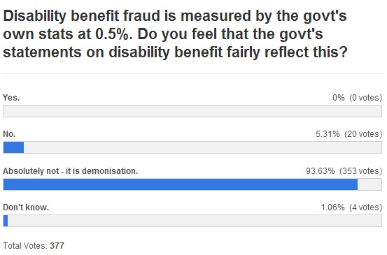 In particular, implications by Iain Duncan Smith and other government spokespeople about disability benefit fraud have been massively misleading. Every single respondent who knew enough to have an opinion agreed that the government’s statements on disability benefit fraud have been unfair – with almost 94% feeling that the government deliberately demonises disabled people in order to win support for its measures.