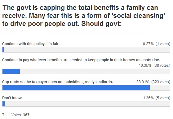 4 out of every 5 respondents felt that mandating a ‘living wage‘ (currently £7.45 outside London, compared to the current minimum wage of £6.19) is the right way to achieve a cut in the benefits bill, as opposed to the government’s plan to cut benefits in real terms without increasing wages, which condemns many people to poverty. Only 1% felt that a living wage is an unworkable idea.
