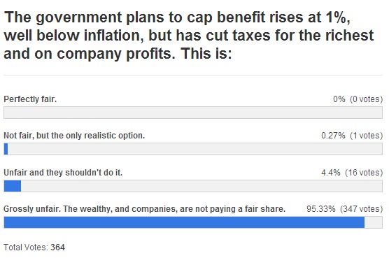 Only 1 person (presumably the same person for all the questions!) felt that it’s fair for the government to cut benefits in real terms while reducing the tax rates for companies and wealthy individuals. More than 95% felt strongly enough about the question to respond that it is grossly unfair. Clearly people are looking for opposition leaders to take a strong stance on this issue, which vindicates completely Labour’s announcement that it will vote against the 1% cap, and shows that George Osborne’s decision to force an unnecessary vote on an ‘uprating amendment’ to try to put Labour out on a limb is simply cynical idiocy.