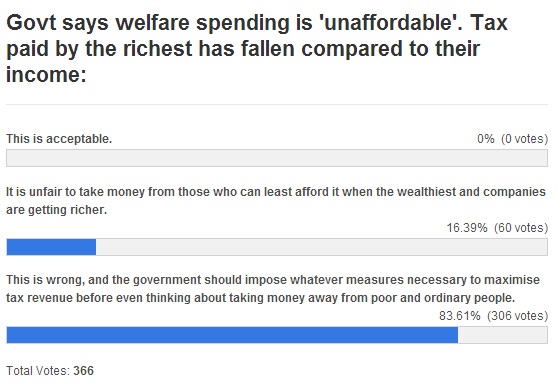 Not even our intrepid single ‘yea-sayer’ could bring himself or herself to say that calling welfare unaffordable while the tax contribution of the richest has fallen relative to their income is acceptable. Of the 100% who felt that it is not, almost 84% were in favour of taking any necessary measures to bring tax revenues up to meet the need before even considering reducing benefits.