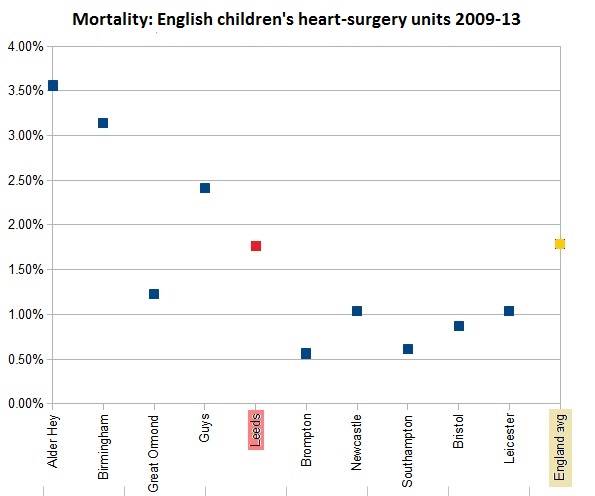 The incandescent surgeon told me that a national measurement of children’s heart-surgery outcomes shows an average “mortality rate within 30 days of surgery” of around 2%. The graph below shows the mortality rates as a percentage of total surgeries for all of England’s children’s heart surgery centres, plus the rate for the country as a whole, for the period from 2009-2013: