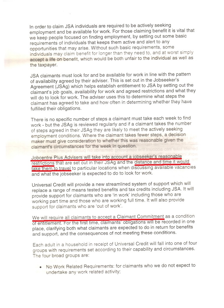 The legislation requires a person to take all reasonable steps to look for work and consideration must be given to their particular circumstances.  However, it appears that a person’s budget is not taken into consideration when the Advisers prepares a Jobseeker’s Agreement.  For example, a lone parent without a computer was expected to go into the Jobentre daily to use the Jobcentre’s computers to look for work as she did not one of her own.  The weekly travel cost amounts to around £15.00.  A friend of mine was initially expected to take 45 steps, which included 20 job applications per week, this was completely unrealistic and too expensive for the type of work she was looking for.  My friend has health issues and a new Agreement was prepared with my assistance; this would not have been the case if she did not have disabilities.  At her New Claim Interview, my friend was simply advised, “the new rules are and you must now do……………..”  [so much for ‘reasonable’ and ‘advisors have the power to..best meet the needs of the individual’!]