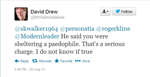 David Drew – a former doctor turned ‘whistleblower’ who likes to present himself as objective and above any ‘nasty stuff’, took the smear a step further – turning ‘supporting’ into ‘sheltering’: