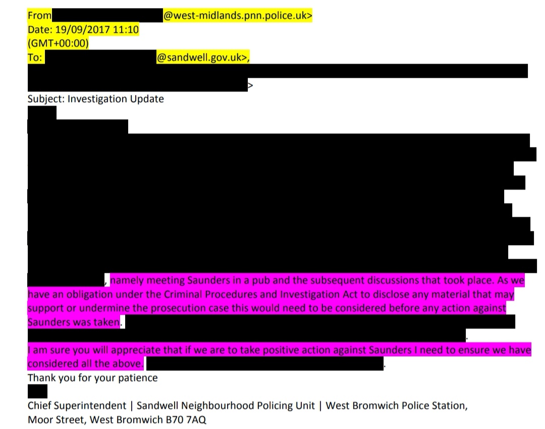 Saunders has published a long and exhaustive article showcasing the often highly-redacted correspondence released to him in response to the SAR. But while the information is partial and heavy going, it reveals that a WMP Chief Superintendent dismissed Eling’s requests for criminal action – and said he was taking disproportionate police time, funds and resources for a matter that should have gone to civil court if Eling felt he had grounds.