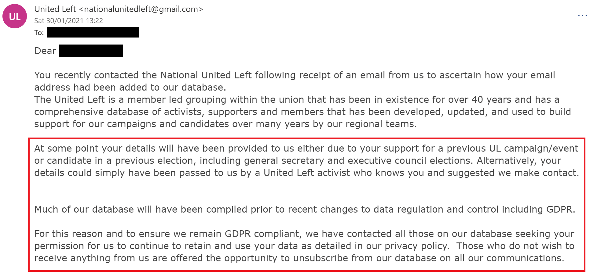 I have also received complaints from Unite members who have clicked to unsubscribe, often several times, yet are still receiving emails. This represents another breach.