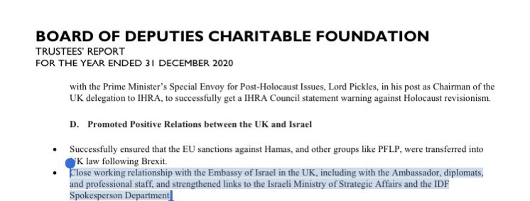 Awkwardly for the Labour party, singer Lowkey recently noted that the trustees of the Board of Deputies – one of the most vocally anti-Corbyn groups – recently published their annual report in which they noted that the BoD ‘promoted positive relations between the UK and Israel’ and had ‘a close working relationship with the Embassy of Israel… and strengthened links to the Israeli Ministry of Strategic Affairs and the [Israel Defence Forces]‘: