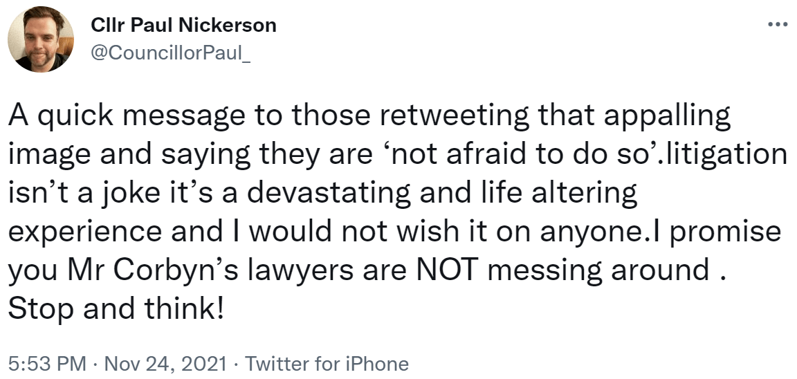 Tory councillor Paul Nickersen has gone in just a few days from defaming former Labour leader Jeremy Corbyn to telling others not to do so, after Corbyn’s lawyers extracted damages and a ‘please retweet’ apology.