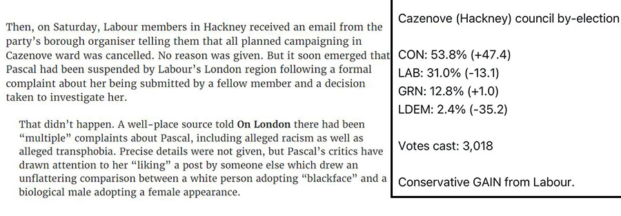 Keir Starmer’s Labour has thrown away a seat in the London borough of Hackney that Labour won overwhelmingly under Corbyn. The Cazenove by-election was won by the Tories, who managed only single digits in the last election: